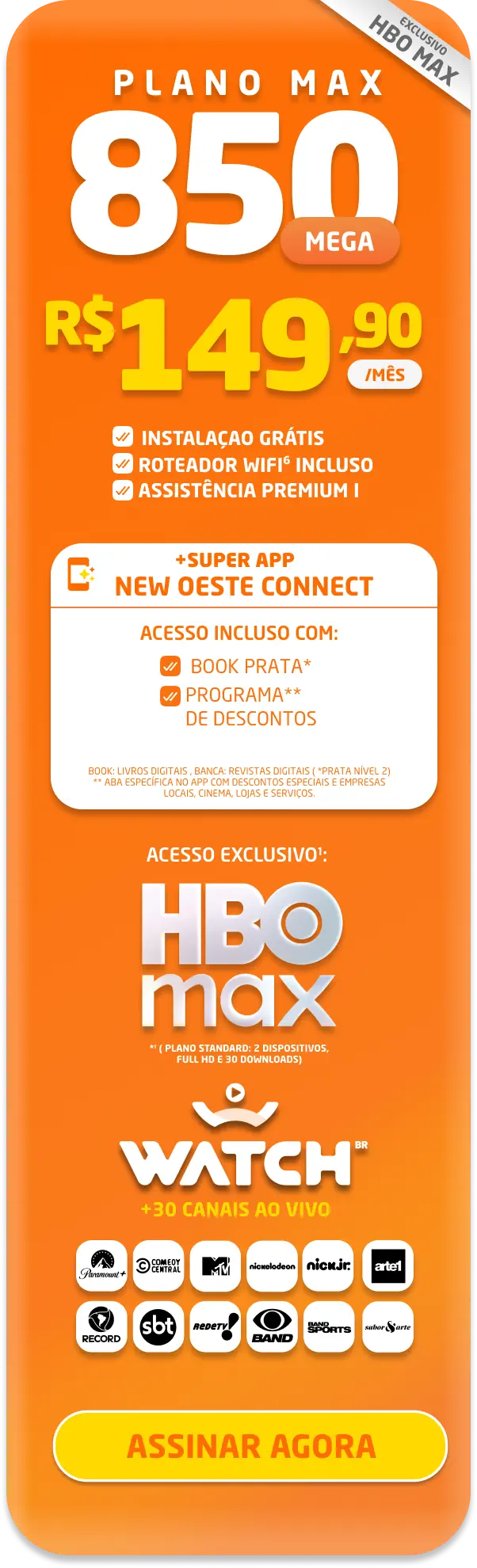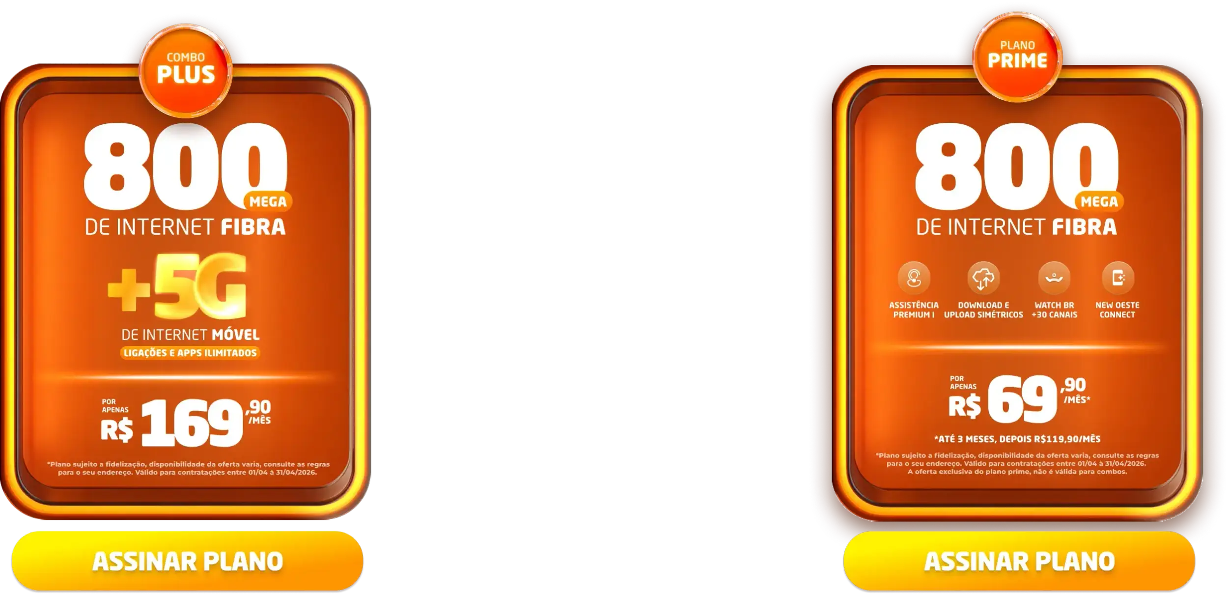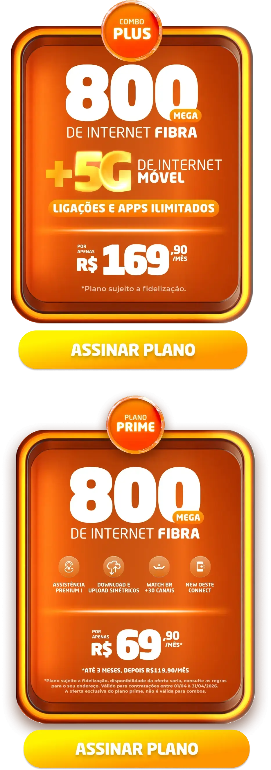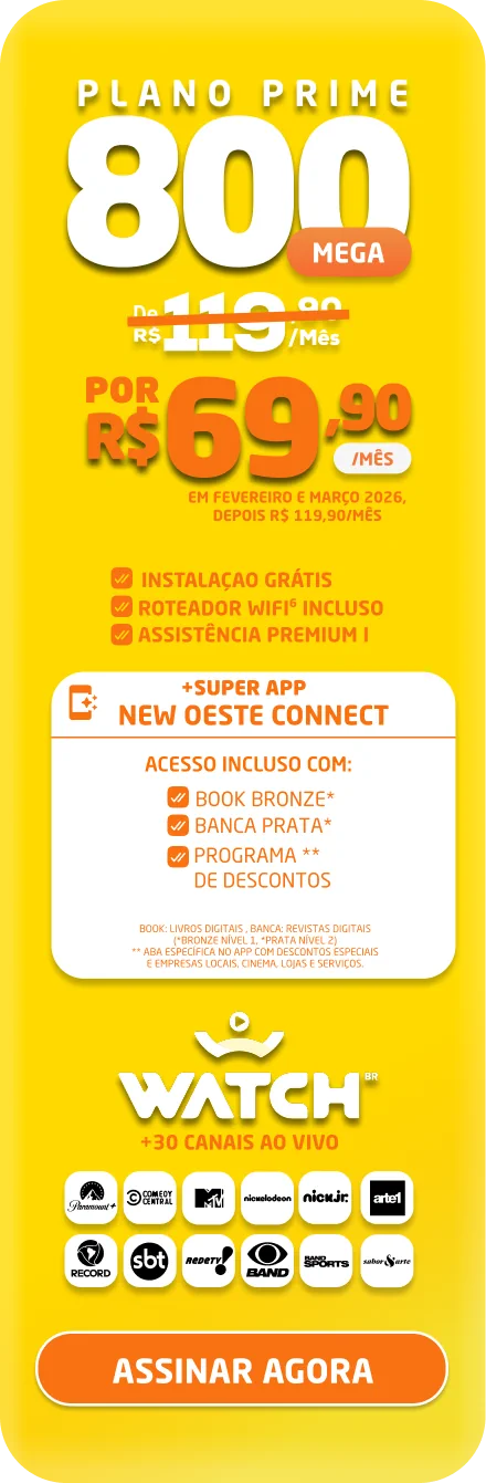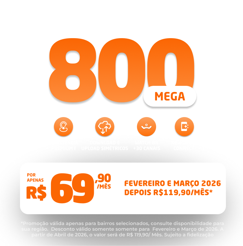 *Planos residenciais sem IP fixo. Com fidelidade de 12 meses, caso haja cancelamento será lavrada multa conforme contrato. A velocidade anunciada de acesso e tráfego na internet é a nominal máxima, podendo sofrer variações decorrentes de fatores externos em conformidade com a Resolução ANATEL nº 614, de 28 de maio de 2013. A instalação está sujeita a disponibilidade técnica de acordo com o endereço. Valores e planos anunciados para tecnologia de Fibra Óptica.