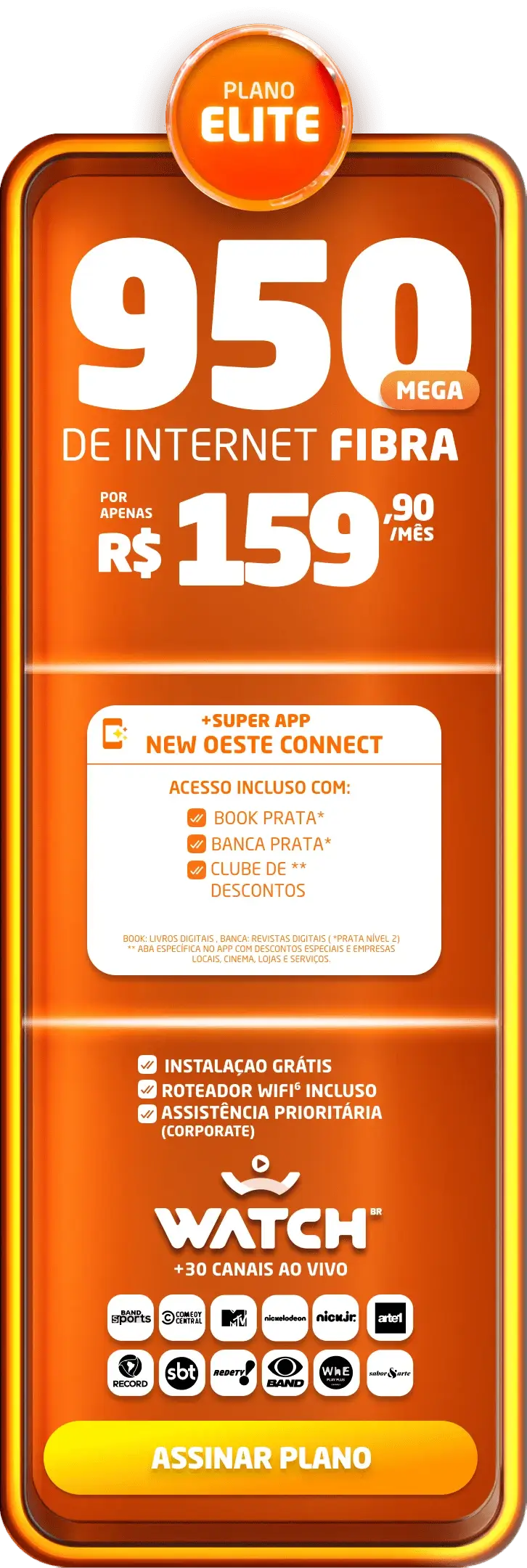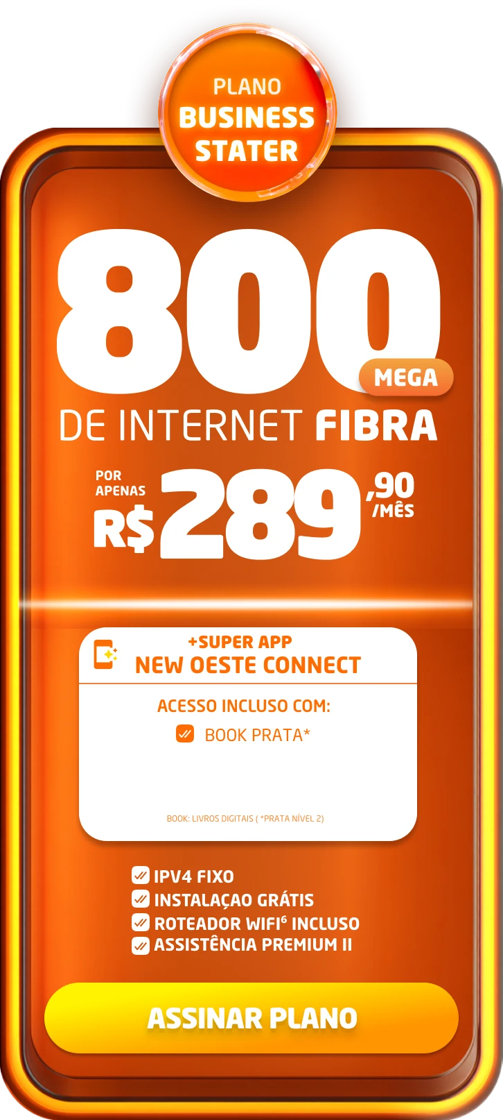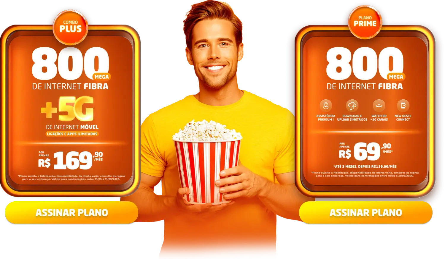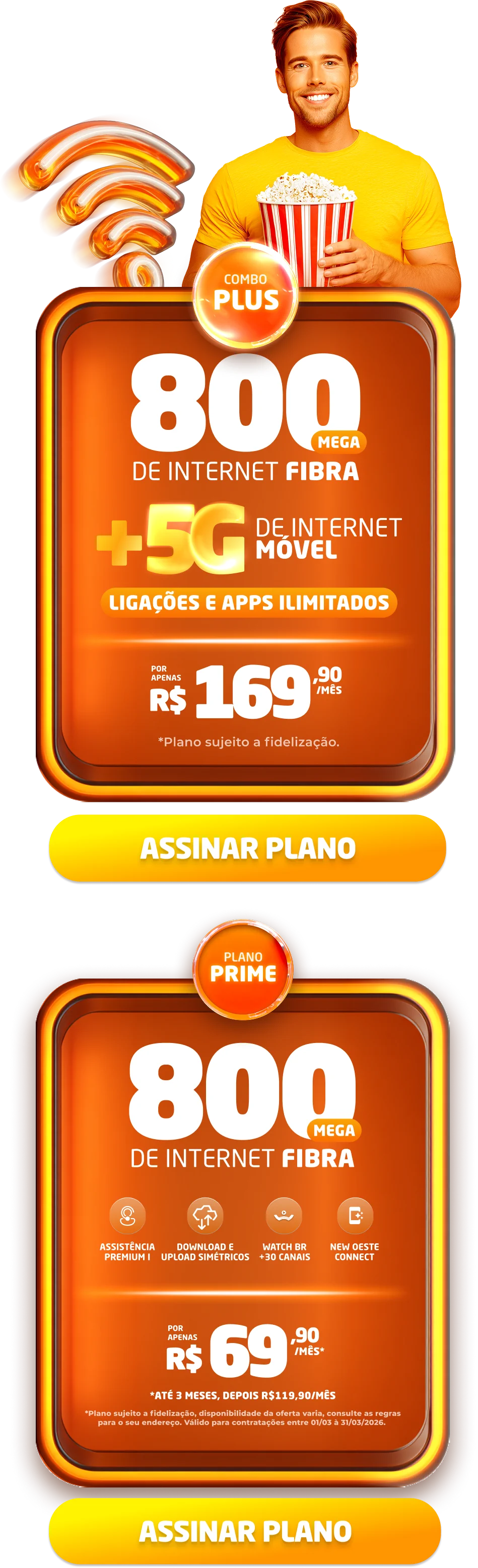 *Planos residenciais sem IP fixo. Com fidelidade de 12 meses, caso haja cancelamento será lavrada multa conforme contrato. A velocidade anunciada de acesso e tráfego na internet é a nominal máxima, podendo sofrer variações decorrentes de fatores externos em conformidade com a Resolução ANATEL nº 614, de 28 de maio de 2013. A instalação está sujeita a disponibilidade técnica de acordo com o endereço. Valores e planos anunciados para tecnologia de Fibra Óptica.