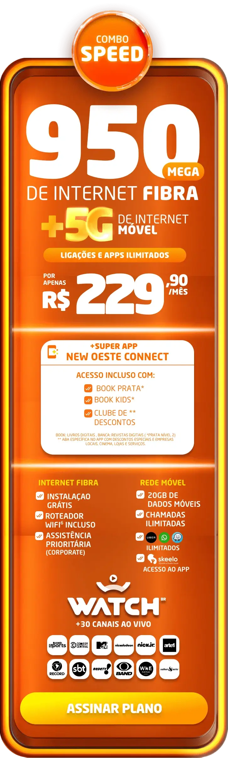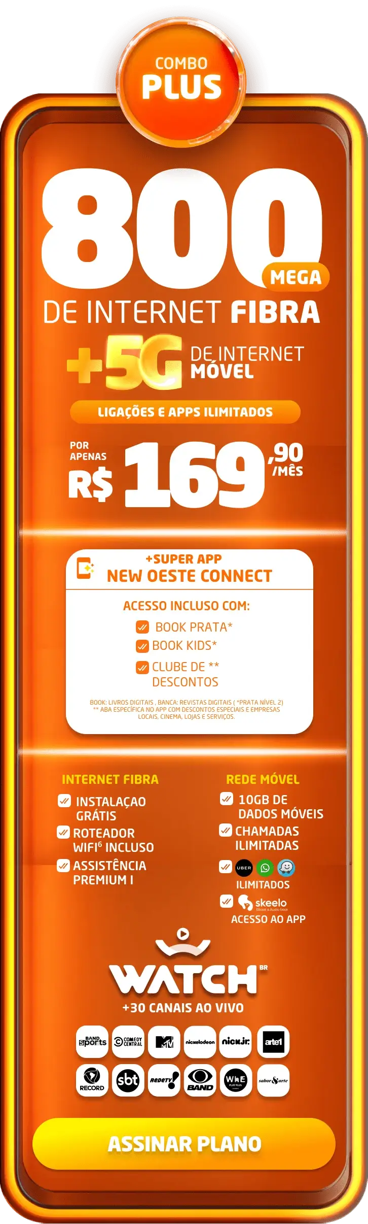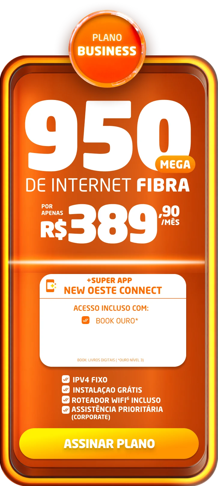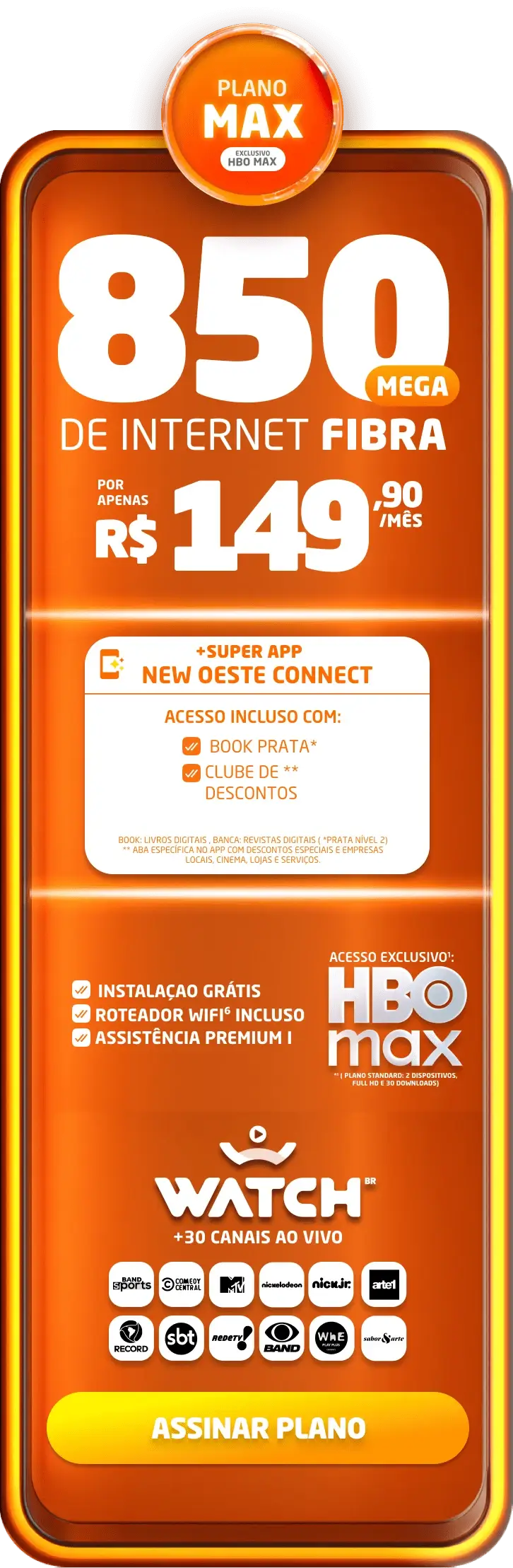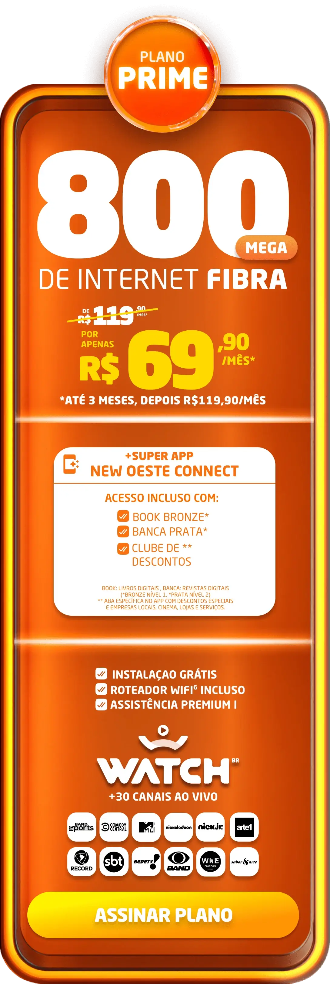 *Planos residenciais sem IP fixo. Com fidelidade de 12 meses, caso haja cancelamento será lavrada multa conforme contrato. A velocidade anunciada de acesso e tráfego na internet é a nominal máxima, podendo sofrer variações decorrentes de fatores externos em conformidade com a Resolução ANATEL nº 614, de 28 de maio de 2013. A instalação está sujeita a disponibilidade técnica de acordo com o endereço. Valores e planos anunciados para tecnologia de Fibra Óptica.