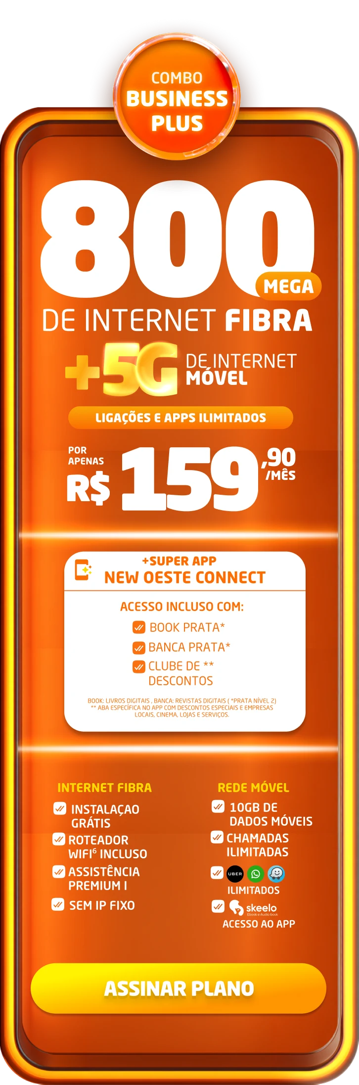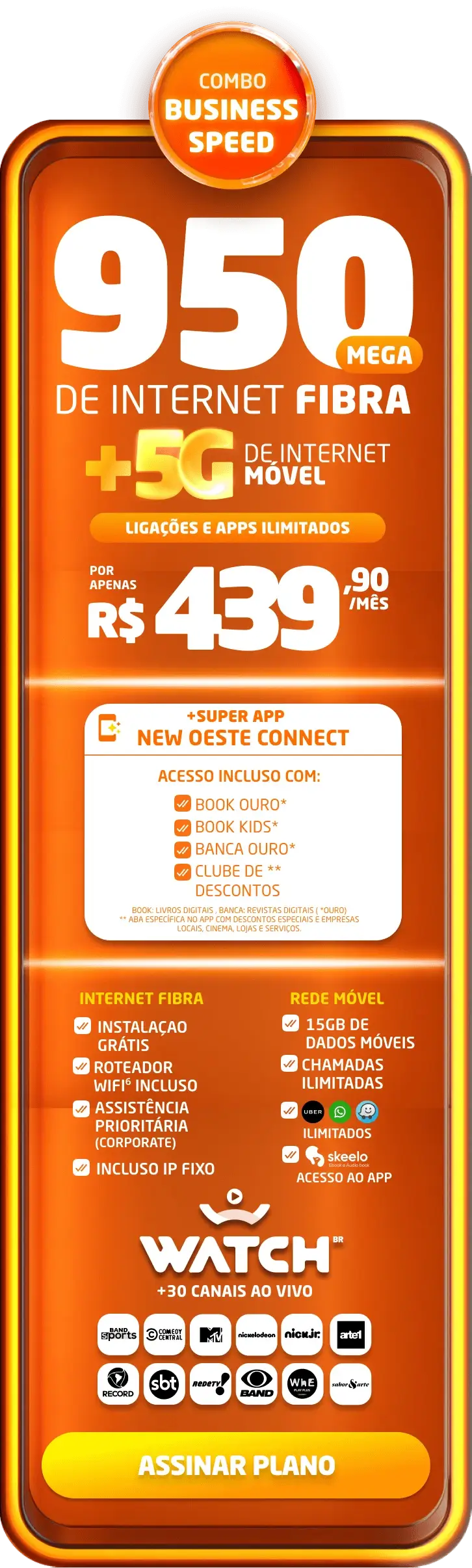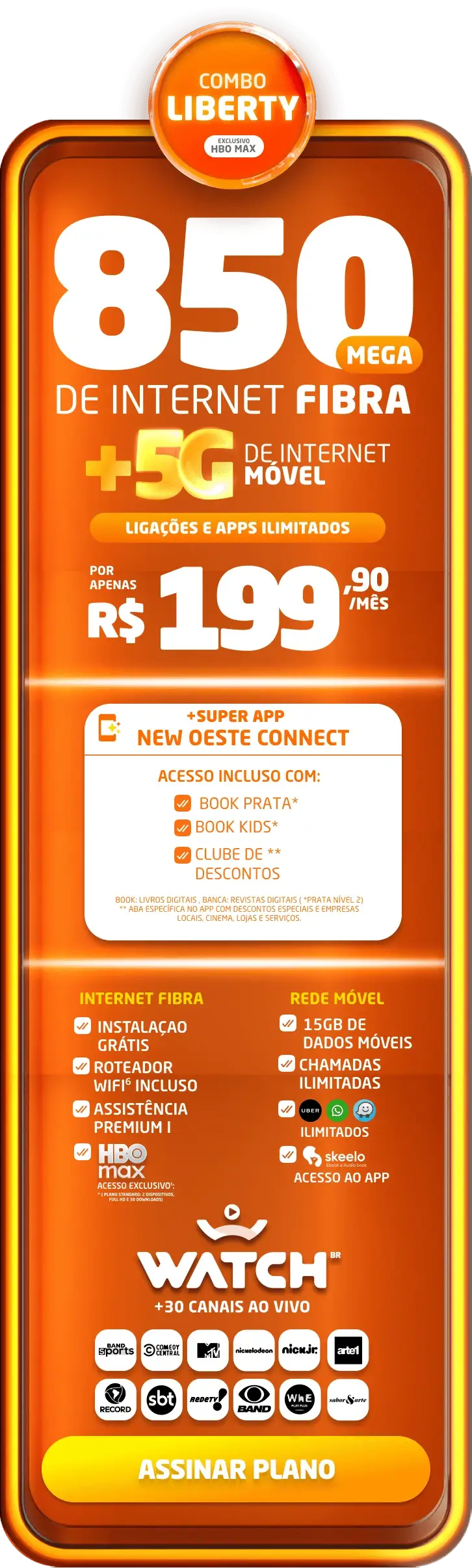 Planos comerciais, com fidelidade de 24 meses, caso haja cancelamento será lavrada multa conforme contrato. A velocidade anunciada de acesso e tráfego na internet é a nominal máxima, podendo sofrer variações decorrentes de fatores externos em conformidade com a Resolução ANATEL nº 614, de 28 de maio de 2013. A instalação está sujeita a disponibilidade técnica de acordo com o endereço. Valores e planos anunciados para tecnologia de Fibra Óptica.